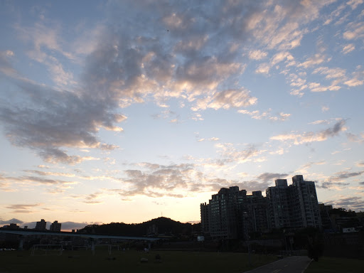 經過樟山寺步道入口,便是一路向下,由於天氣好、遊客多,我也不敢太過放肆,車速最高只到43公里左右。回到平地,看看里程表還不滿10公里,於是回到河濱把里程數補足。此時天色漸案,黃昏的雲彩讓我放棄下坡的加速停下車來,真是個美好的下午呀!