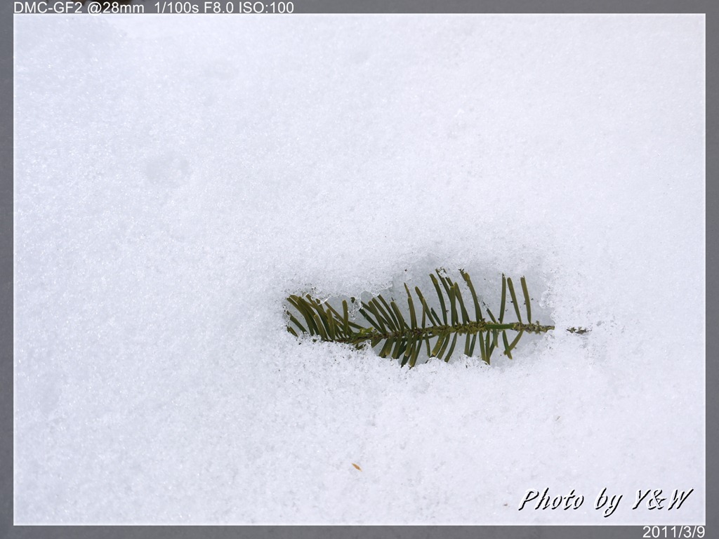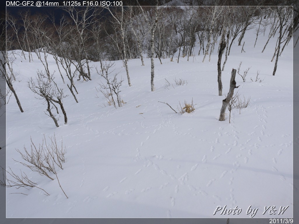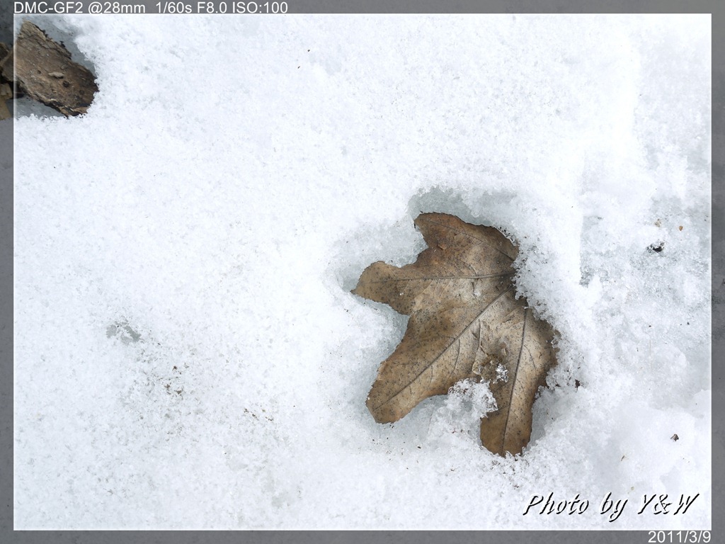 和琴半島有一條環島的「自然探勝路」,全長約4.2公里,走一趟大概需要一小時,然而步道冬季為白雪所覆蓋,行走起來困難許多,我們大概走不到1/4就決定回頭啦!有趣的是看道路邊掉落下來的葉片,像是烙印般的「嵌入」在雪地中。推測大概是太陽出來後,這些落葉等雪地上深色的東西吸收陽光的熱能,因此在雪裡「溶」出了印記。