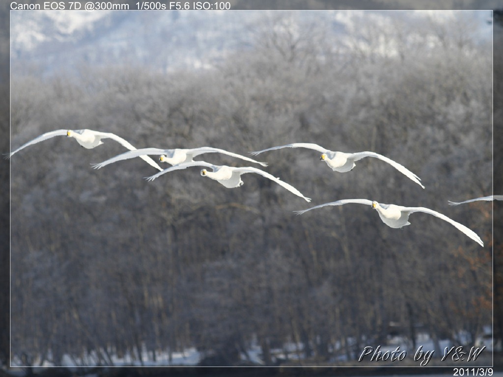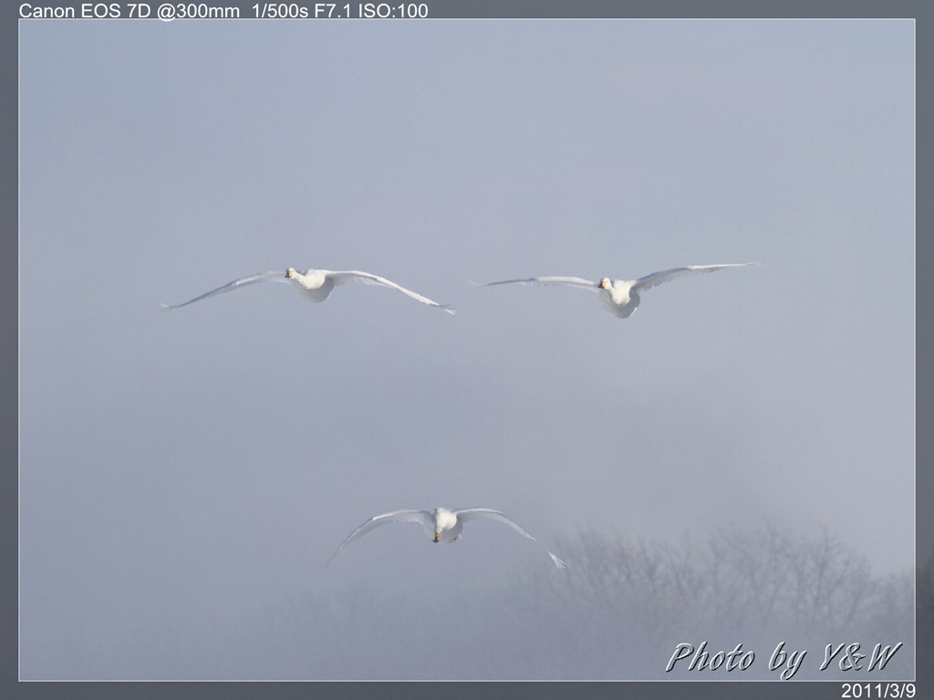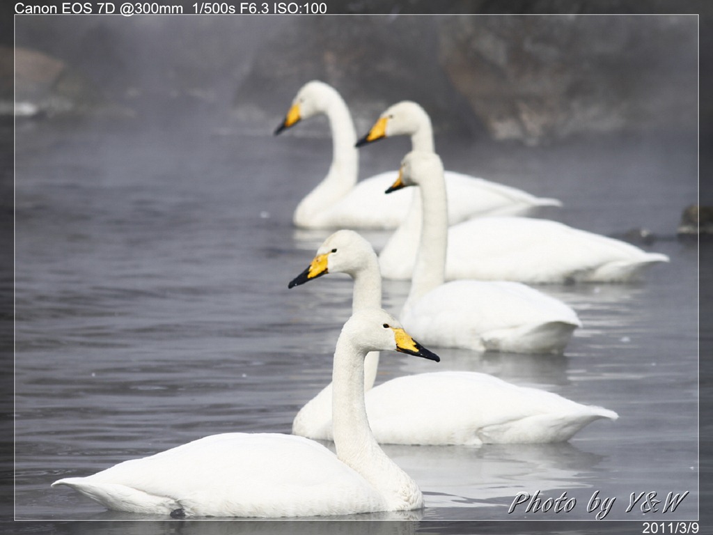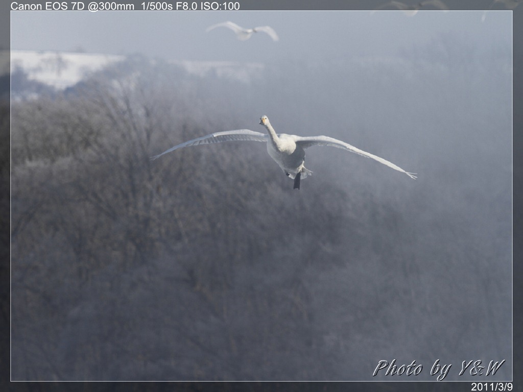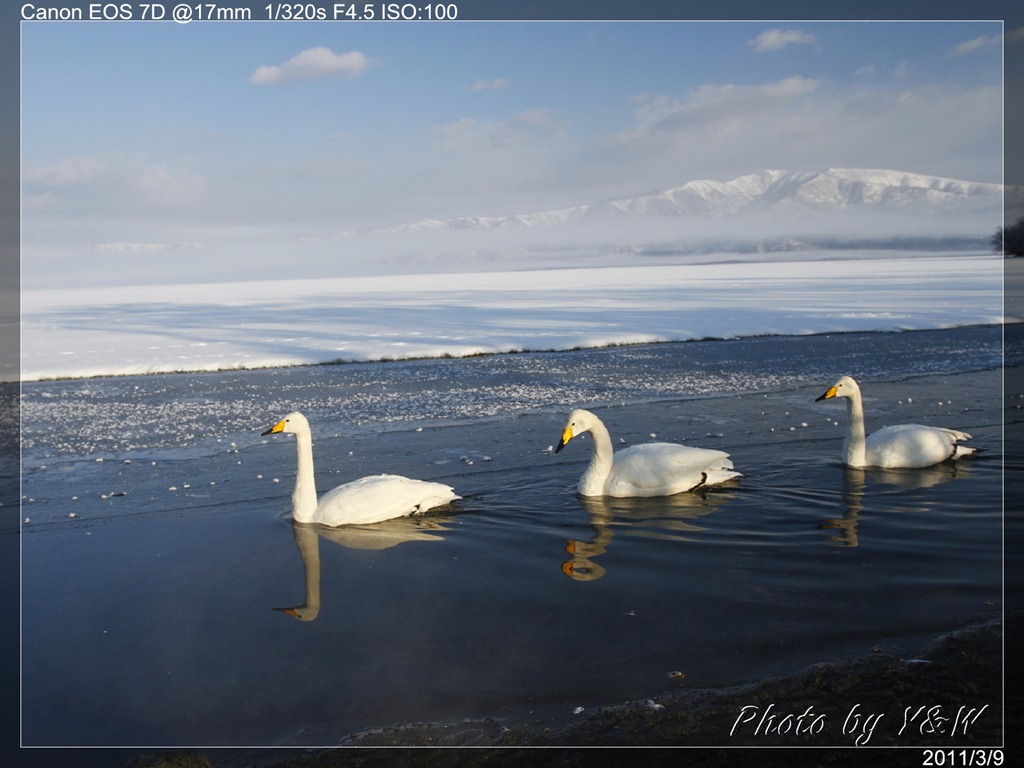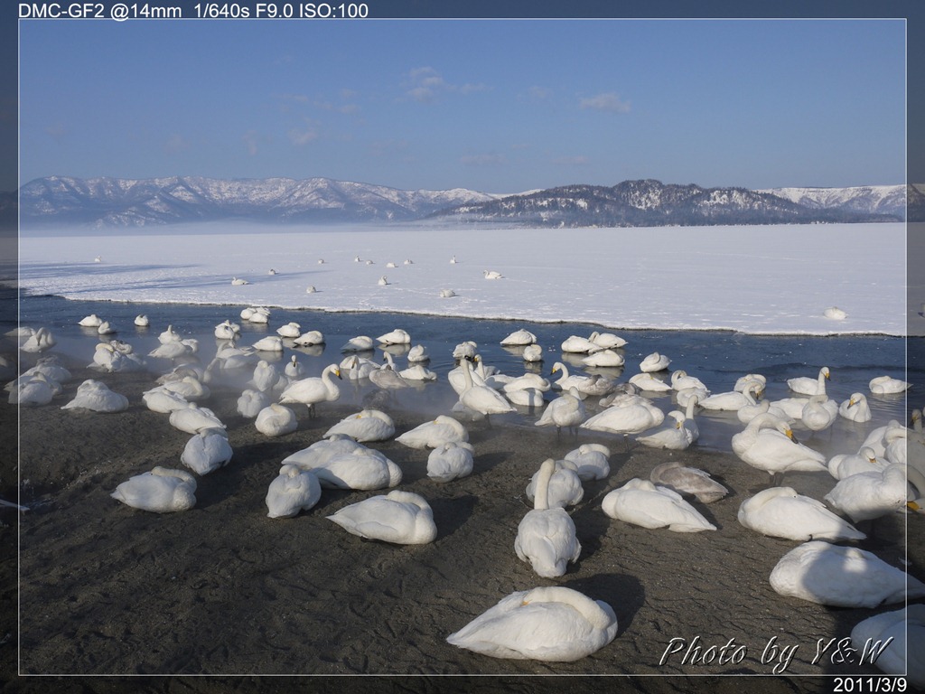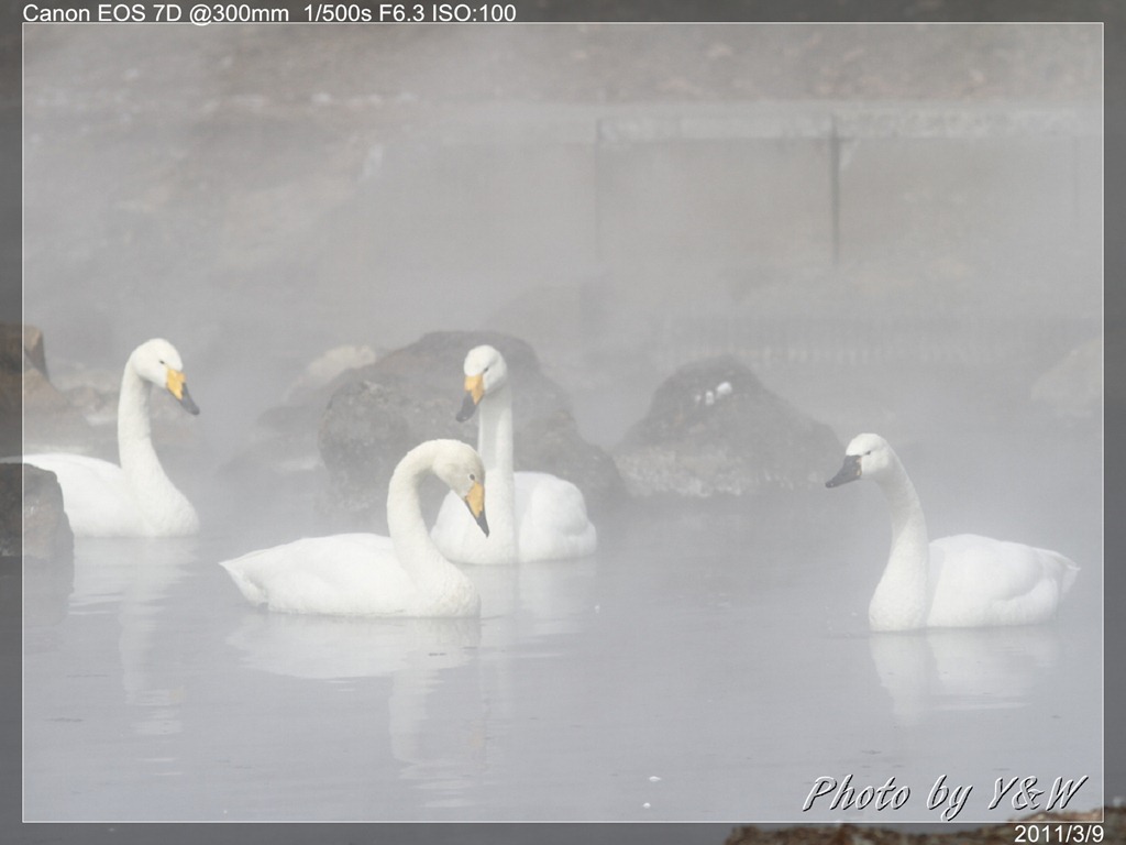 清晨的低溫下,一隻隻的大天鵝把脖子藏在翅膀下睡著,遠遠望去彷彿一顆顆的白色石頭。隨著日頭建高,大天鵝們一隻隻從睡夢中疏醒,開始伸伸懶腰,拍翅活動。有趣的是,大天鵝們彷彿約好了似的,紛紛開始向中心聚集。睡在比較外圍的,緩緩的游近,遠處的湖案森林邊,也開始有一群群的大天鵝陸續列隊飛來,天際飛來的天鵝,襯上遠處的森林、溫泉的霧氣,此景著實迷人。