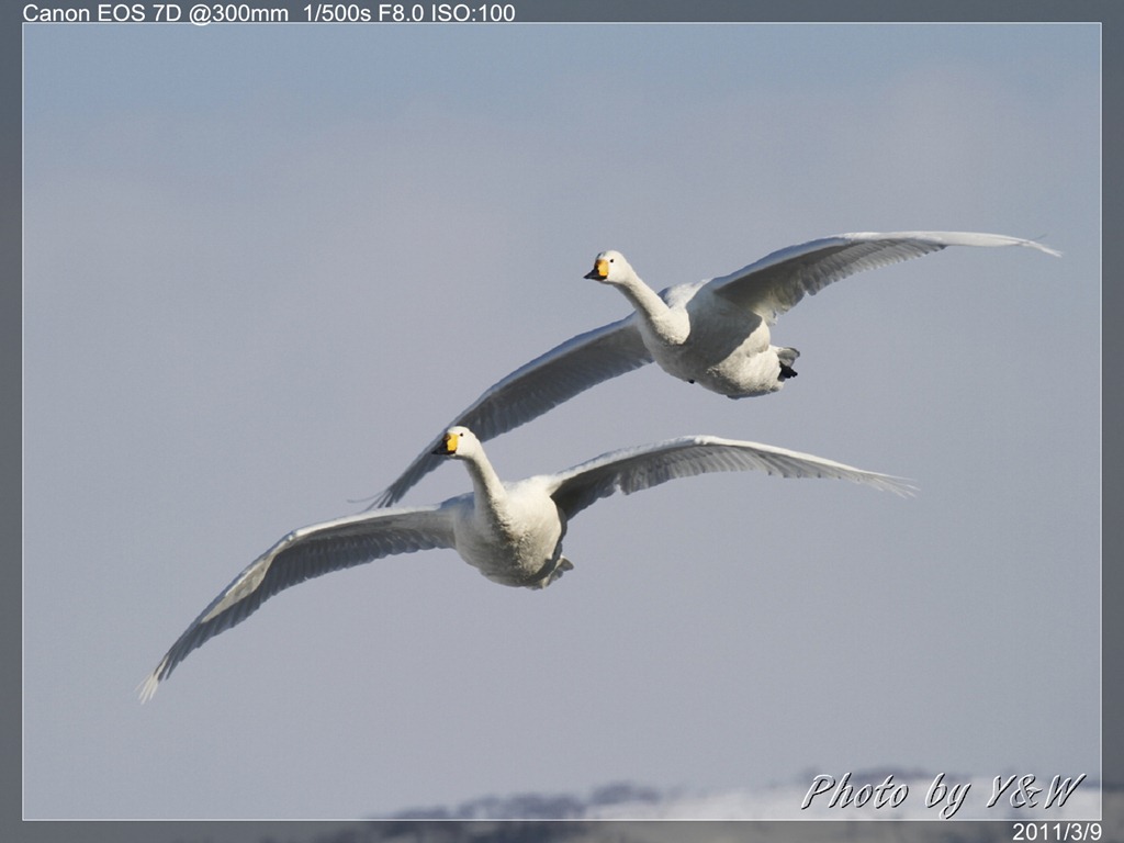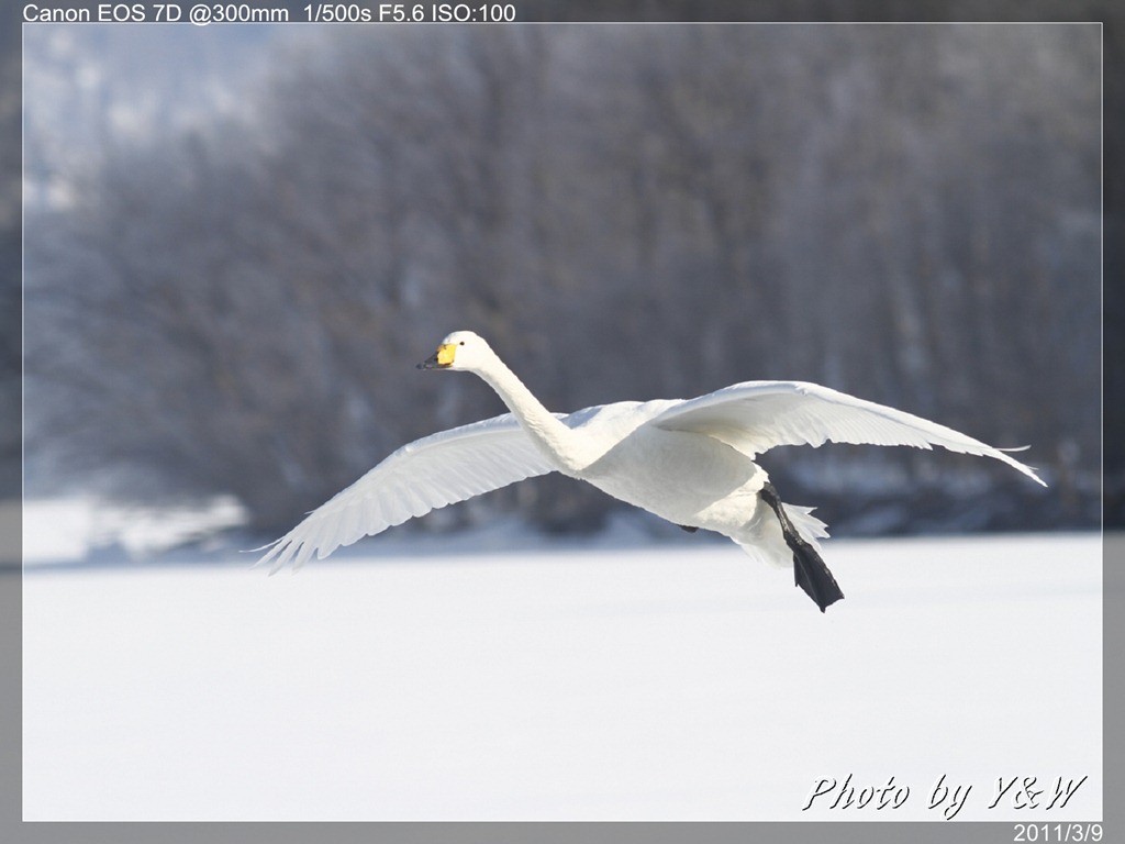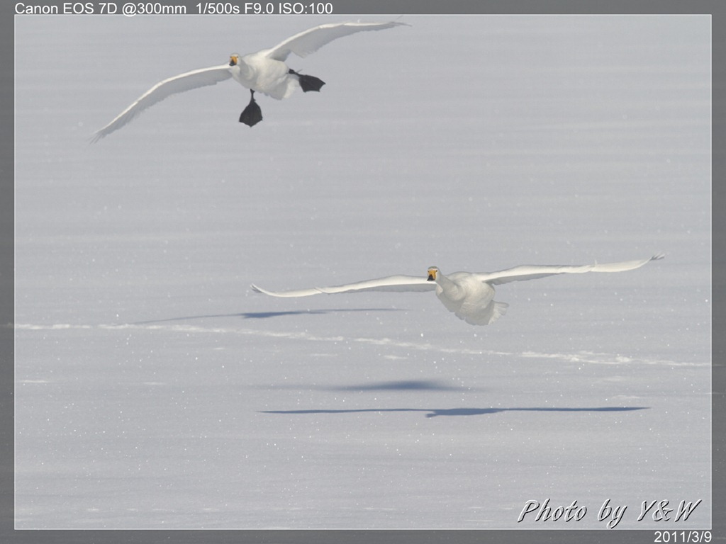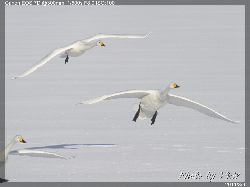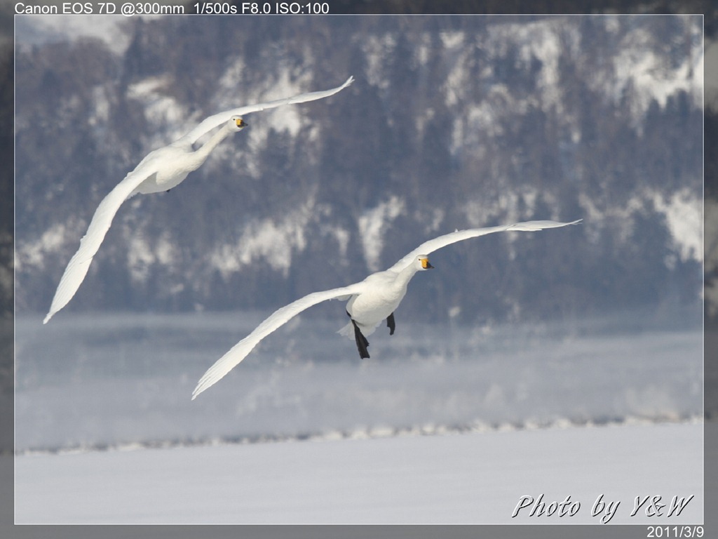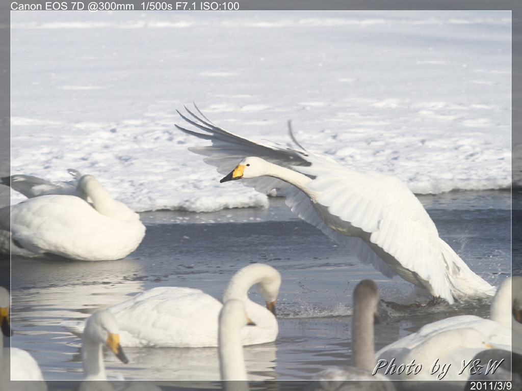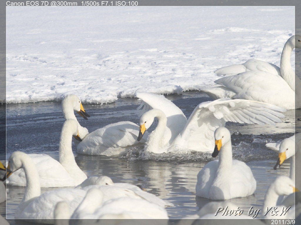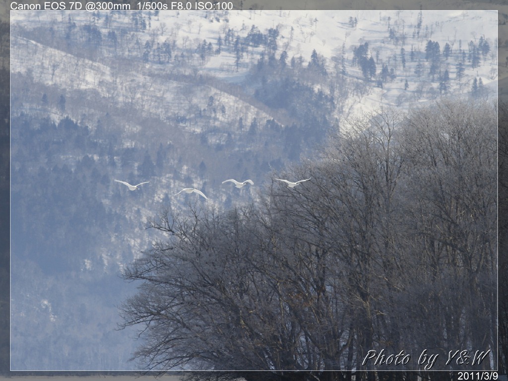 清晨的低溫下,一隻隻的大天鵝把脖子藏在翅膀下睡著,遠遠望去彷彿一顆顆的白色石頭。隨著日頭建高,大天鵝們一隻隻從睡夢中疏醒,開始伸伸懶腰,拍翅活動。有趣的是,大天鵝們彷彿約好了似的,紛紛開始向中心聚集。睡在比較外圍的,緩緩的游近,遠處的湖案森林邊,也開始有一群群的大天鵝陸續列隊飛來,天際飛來的天鵝,襯上遠處的森林、溫泉的霧氣,此景著實迷人。