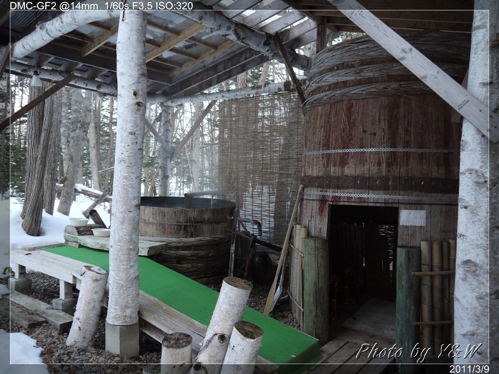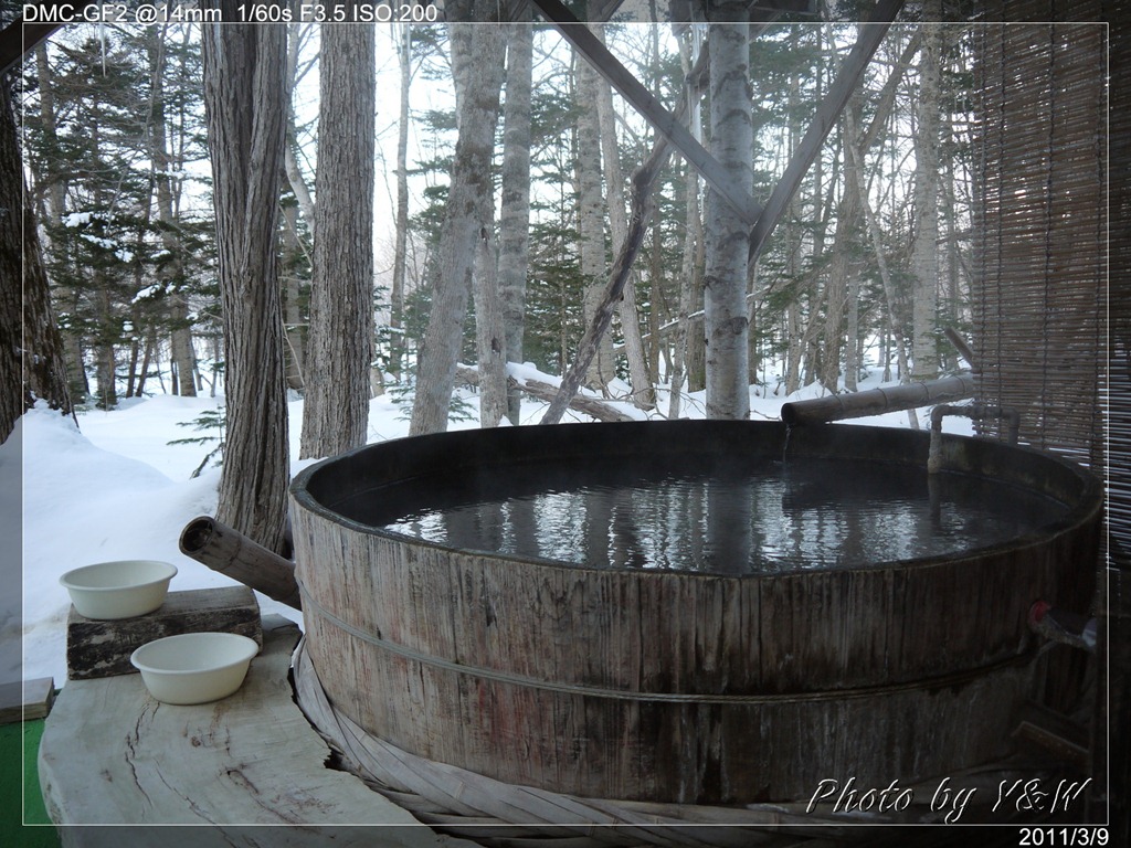 民宿的露天湯屋位於後方的林子裡,以簡單的木料搭築,遊客可以一邊泡在大木桶中,一邊享受林下的景色,是Papiloi民宿的一大特色。雖然此時的氣溫已經「上升」到了零下8度,要在雪地裡頭脫光泡溫泉還真是一大挑戰。不過一旦泡在這雪地裡的露天溫泉,那種舒服的滋味,大概只有砂湯的天鵝以及傳說中會泡溫泉的日本獼猴能夠瞭解吧!