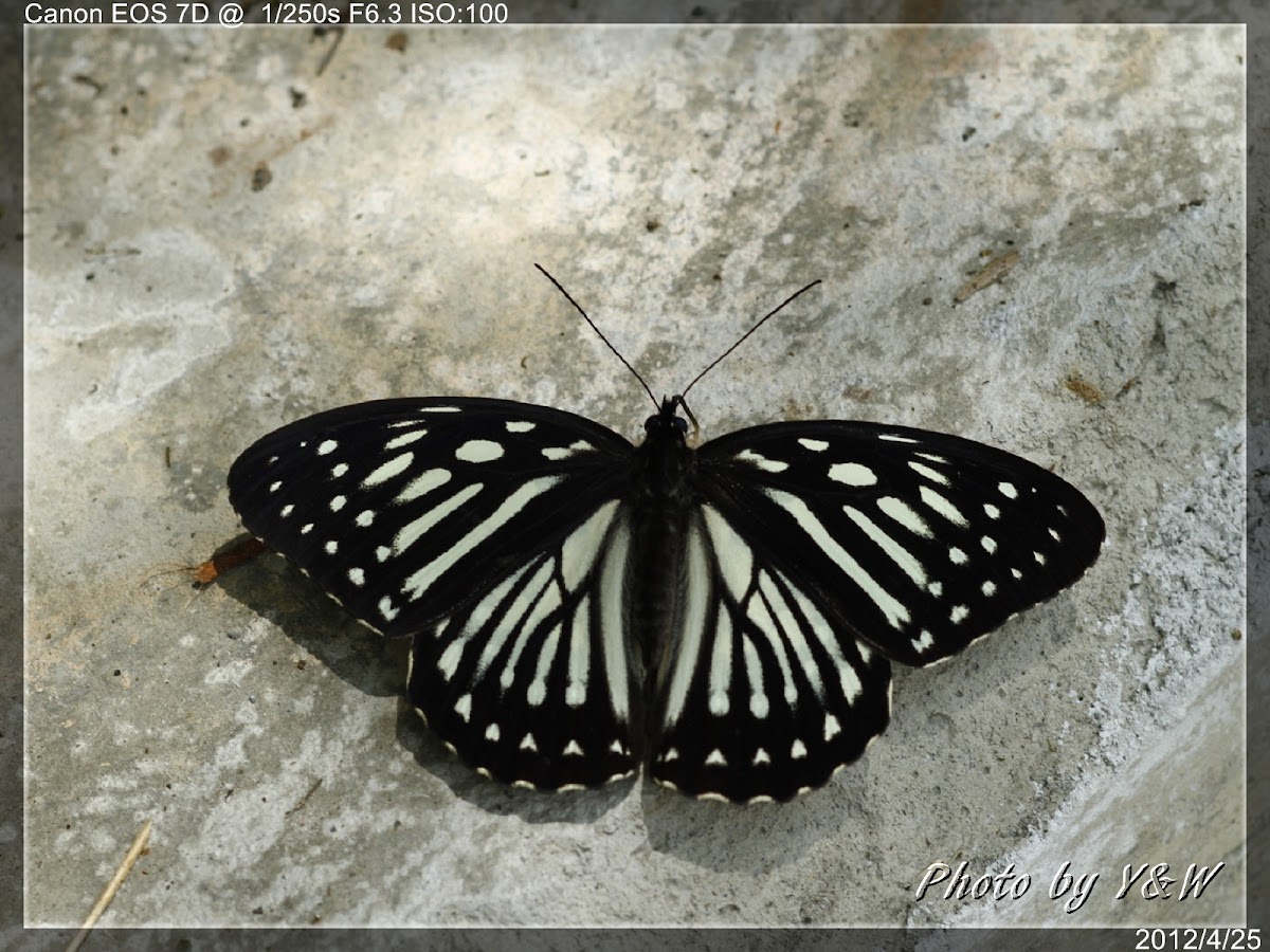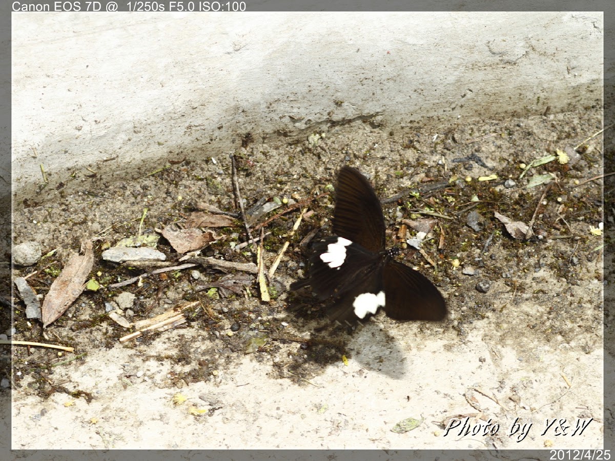 不得其門而入的我們隨即轉往大漢橋一帶,時間接近上午11點,應該已是蝴蝶活動的高峰時間,納悶的是蝶況卻沒有預期的好。不曉得是不是與公路旁剛除過草,所有可以作為蜜源的小花全被割光了有關。只零星記到了幾隻臺灣黑燕小灰蝶、黑弄蝶與寬青帶鳳蝶。倒是過了大漢橋後,路旁新築好的水泥護坡上,不知為何反而吸引了許多蝴蝶在此徘徊。包括了小三線蝶、青帶鳳蝶、臺灣白紋鳳蝶、黃三線蝶、長鬚蝶以及姬雙尾蝶等,其中還有一隻白條斑蔭蝶無視於我們的接近,恣意地在吸取鹽分,連美樂蒂都很難不注意到牠的存在,好奇地想伸手去抓呢!