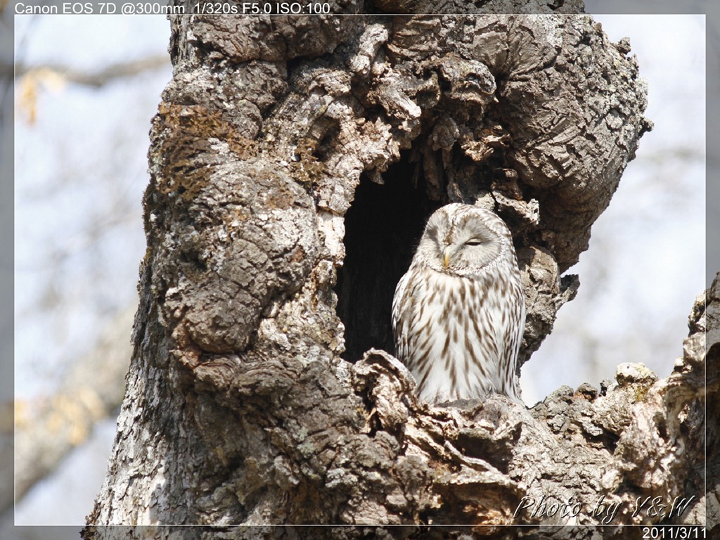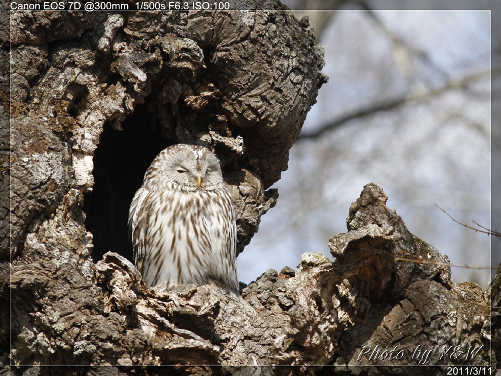 告別了丹頂鶴的舞台,下一站將拜訪森林賢者-長尾林鴞(Strix uralensis)。長尾林鴞主要活動於歐亞大陸北邊的亞寒帶森林中,是黑夜中的獵者,主要捕食小型哺乳動物及其他鳥類。白天是他休息睡眠的時間,多半在樹洞中打盹。出發前,安藤桑還特別說到,萬一牠躲在樹洞較深處,恐怕很難見到牠的全貌。到了現場,長尾林鴞倒也沒讓遠道而來的我們失望,大辣辣地站在樹洞口,睡眼朦朧略帶無辜的眼神顯得特別可愛。