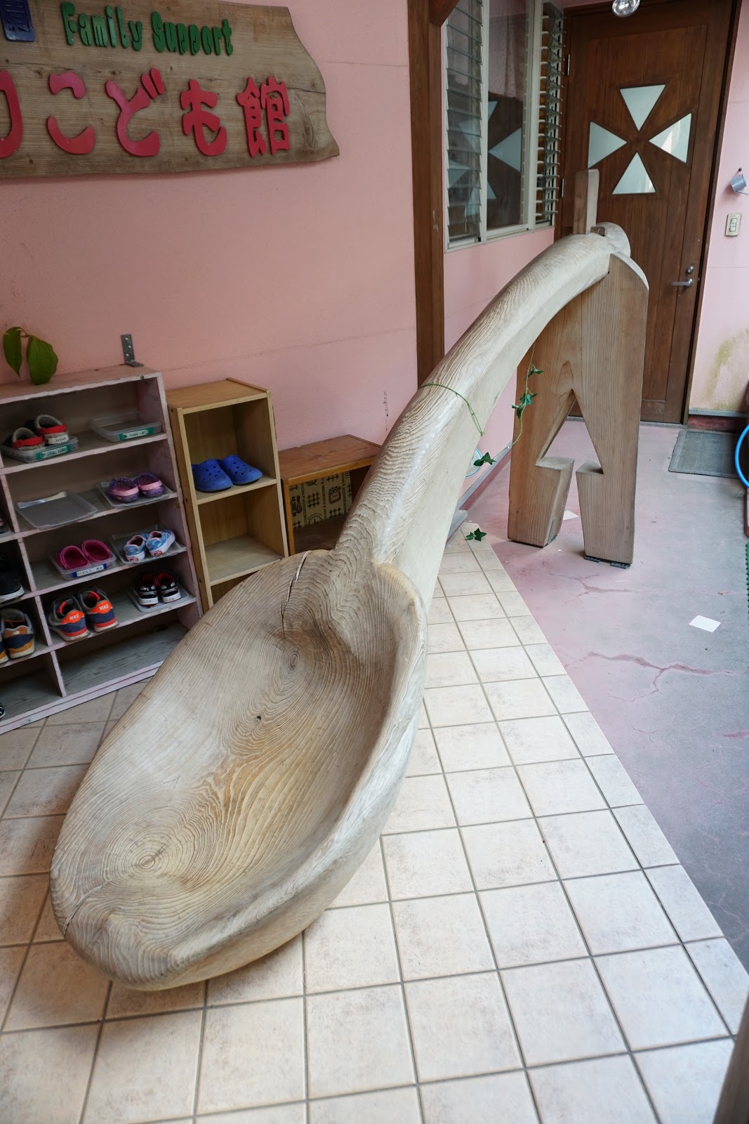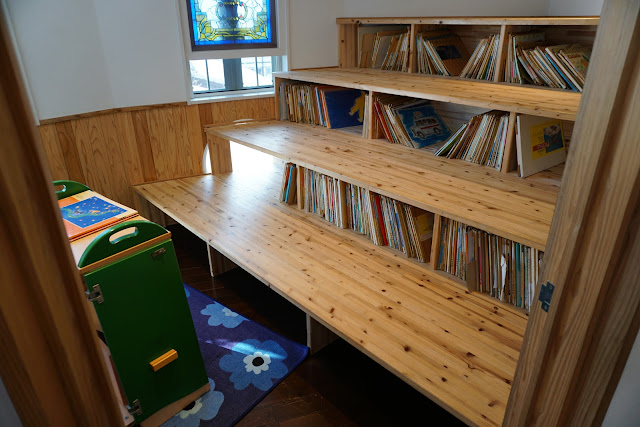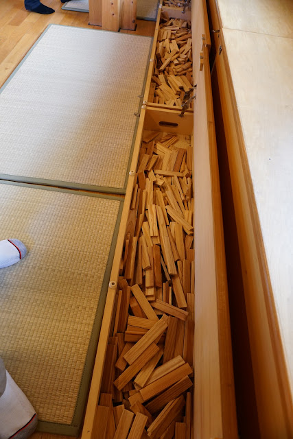 除此之外,該園有兩幢建築採用了木構造,其中一幢是禮堂兼室內活動空間,除了建築本身的木構造、地板、內裝以外,還有許多小朋友的玩具都是以日本國產的原木作為材料。這樣從小在樹、草、田、木頭等自然元素的陪伴下成長。相較於只能在室內空間踩著巧拼地板、玩著塑膠玩具的台北都市小孩,其身、心、靈的健康與幸福,實在不可同日而語。