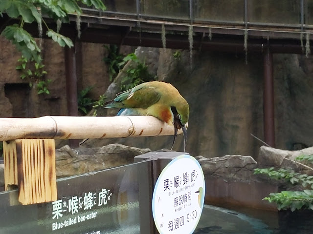 經過小樹林後,來到較寬廣的平台,一隻栗喉蜂虎就停在他自己的解說牌上方。幸運地我們還當場看他吐了個「食繭」出來,彷彿是排好班特地來表演的。說道熱帶雨林館的3隻栗喉蜂虎的「身世」還有一段故事。這三隻栗喉蜂虎來自金門,當初來到動物園時還是三顆小小的鳥蛋,而這鳥蛋則是在野外被成鳥踢出巢外的「棄蛋」。栗喉蜂虎是金門的夏候鳥,每年夏天會從東南亞飛到金門繁殖。牠們築巢時會在土坡上挖洞,而且有大夥把巢洞挖在同一區的土坡上的習慣,稱為「集體營巢」。這樣的做法好處是遇到天敵來襲可以「群起攻之」,共同抵禦,壞處就是可能讓隔壁的「小王」、「小三」「近水樓台」,或是懶惰的父母「有意無意」地把蛋「下錯巢洞」。而這些「棄蛋」,根據研究人員的推測,就是巢洞主人在發現被「寄孵、寄養」時,不願意憑白無故多個小孩而「掃地出門」的鳥蛋。不過畢竟「鳥蛋是無辜的!」栗喉蜂虎的研究人員-金門國家公園管理處與台大森林系袁孝維老師團隊與台北市立動物園合作,將這些棄蛋帶回台北,利用人工孵蛋器孵化,順利孵出了這3隻蜂虎,並且在動物園的悉心照顧之下,才能「頭好壯壯」的在熱帶雨林館與大家見面。